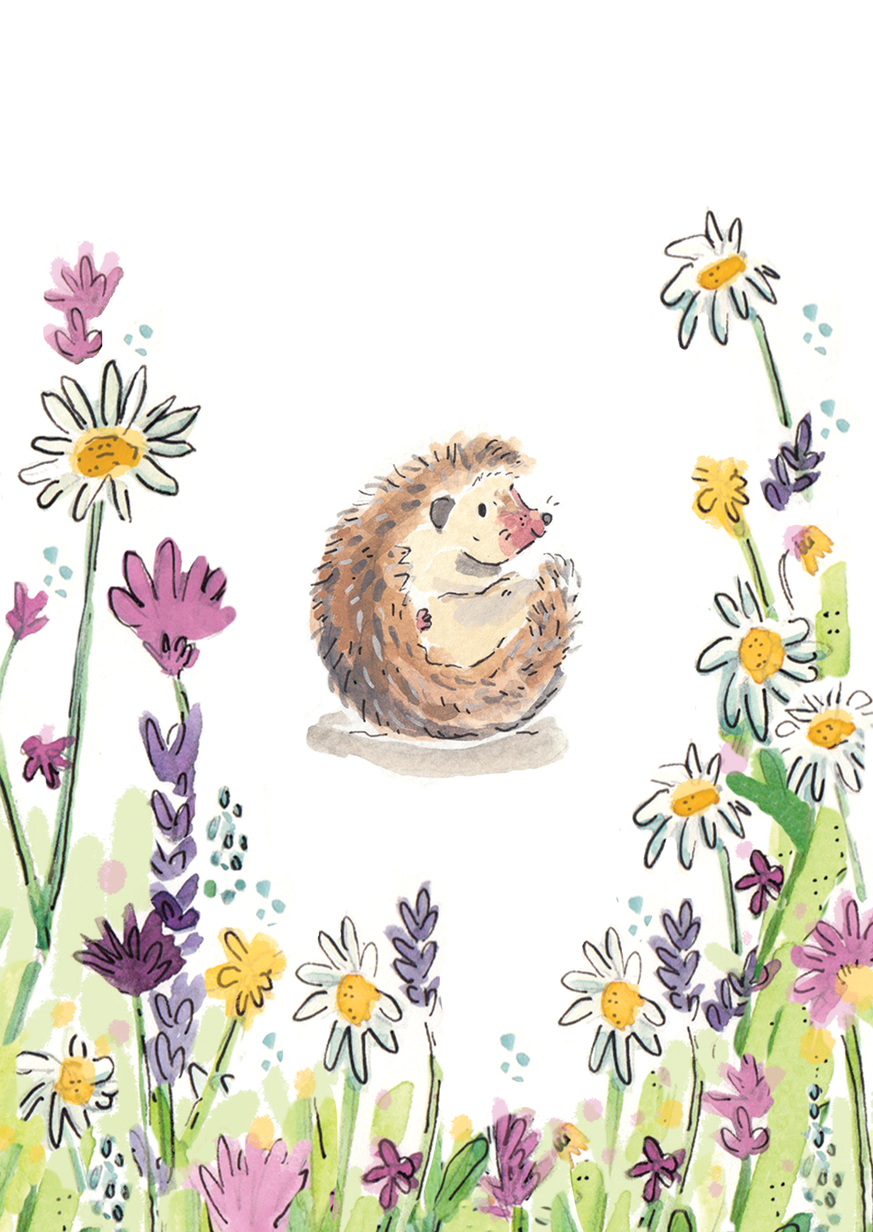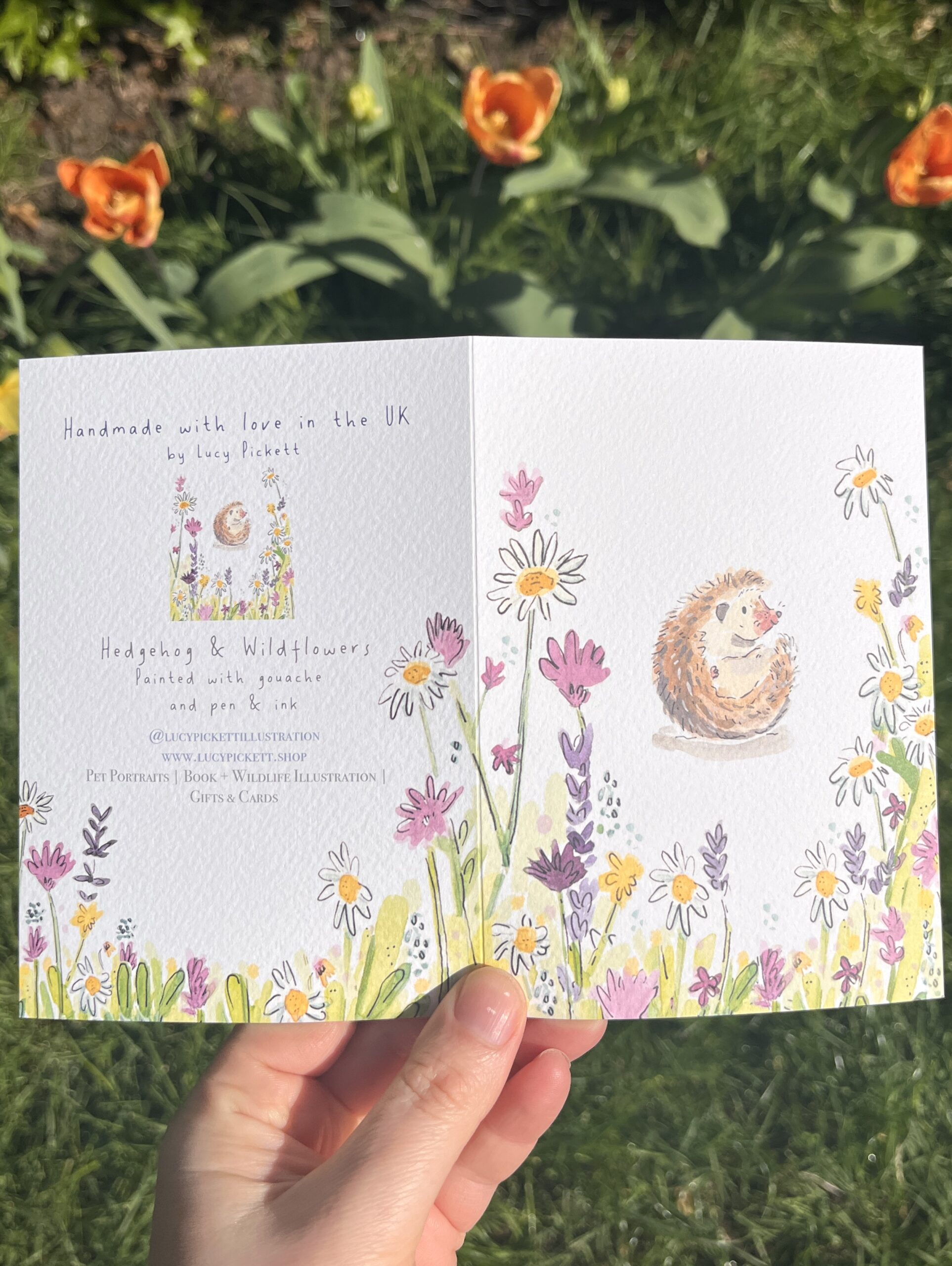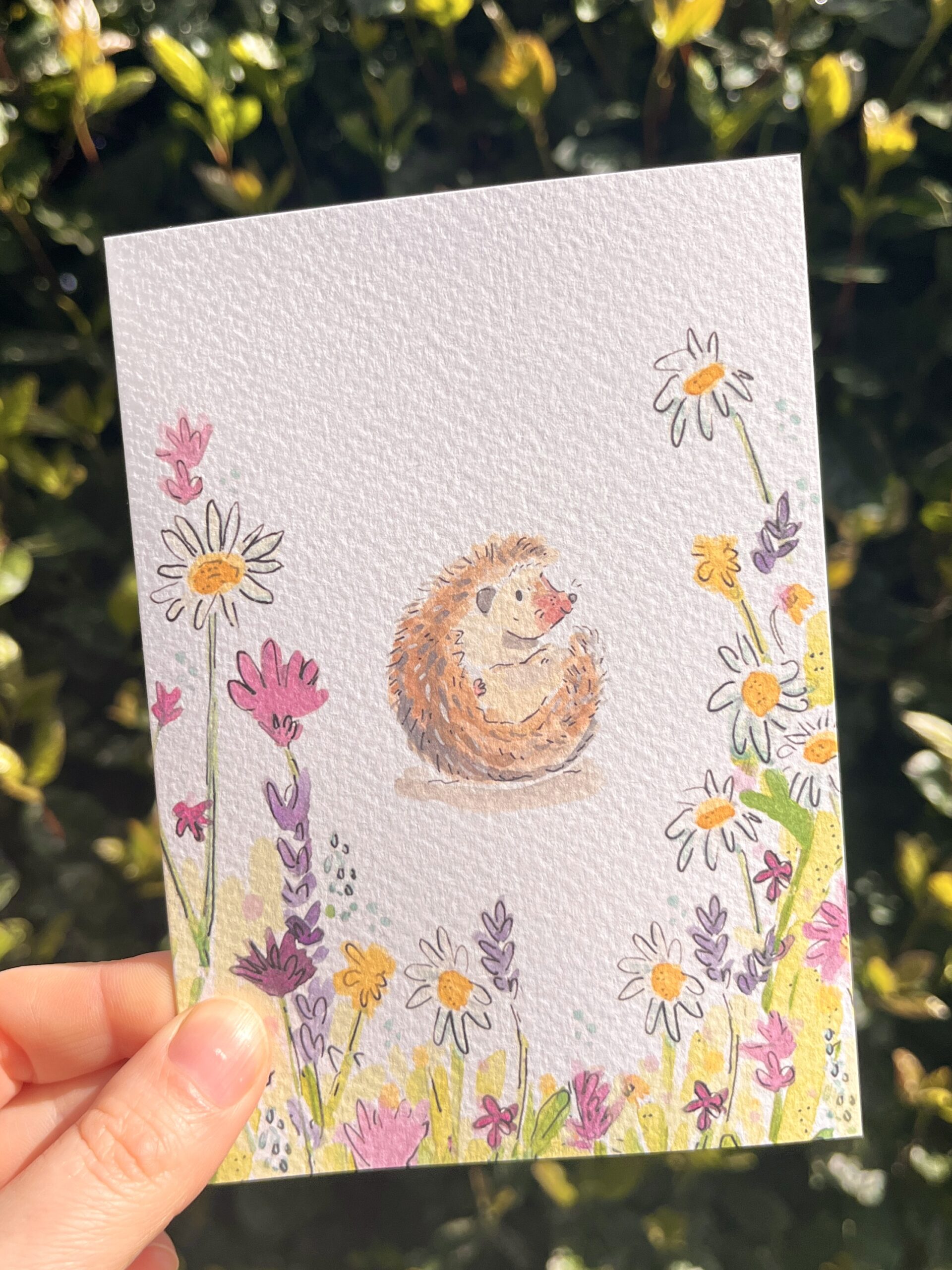 Cute and colourful hedgehog greetings card, perfect for any occasion such as birthday, anniversary, graduation, christening or “just to say”! Blank note card for your own message and double sided design.